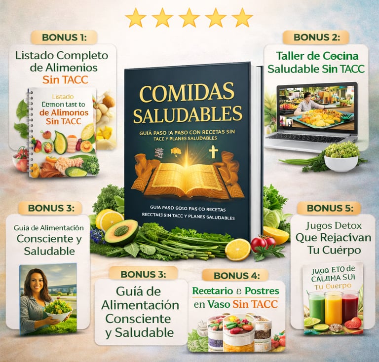 Al adquirir COMIDAS SALUDABLES hoy, recibirás totalmente GRATIS estos 6 bonos exclusivos que potenciarán tu alimentación, tu energía y tu bienestar diario:
